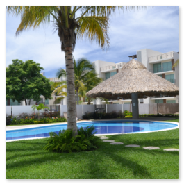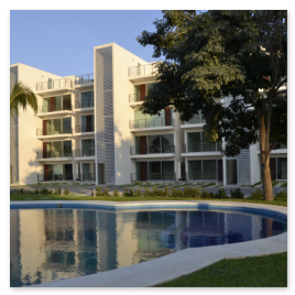 Dentro del plan maestro de Residencial Diamante concebimos condominios verticales y el flujo de ventas nos catapultó a construir el Condomino Lila, repetimos el concepto para mantener el estilo arquitectónico en 7 torres de 8 departamentos cada una. Roof garden privado así como alberca, palapa y jardines.