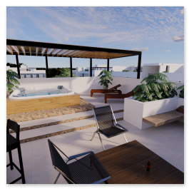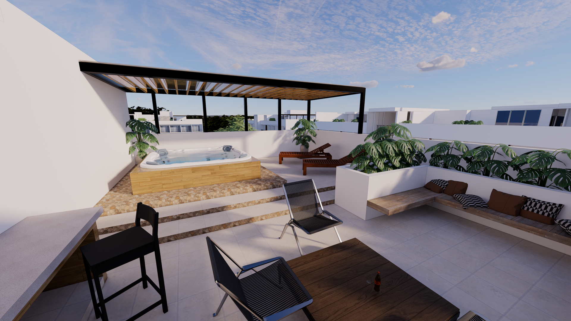 En Residencial Diamante desarrollamos un nuevo concepto de condominio, en donde añadimos áreas comunes generales que dan mayor valor a las propiedades. Un Roof Garden de uso general, con área de jacuzzis, bar y área de asadores y zona de comida.